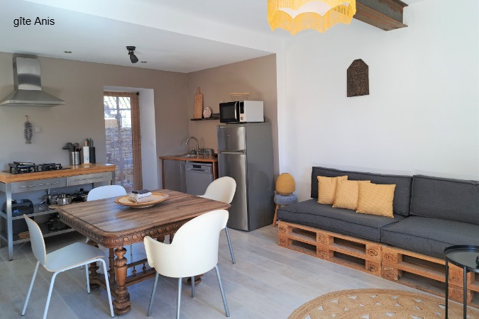 sfeervolle, gezellige gîte met groot terras, badkamer, aparte slaapkamer, woonkamer met open keuken en slaapbank